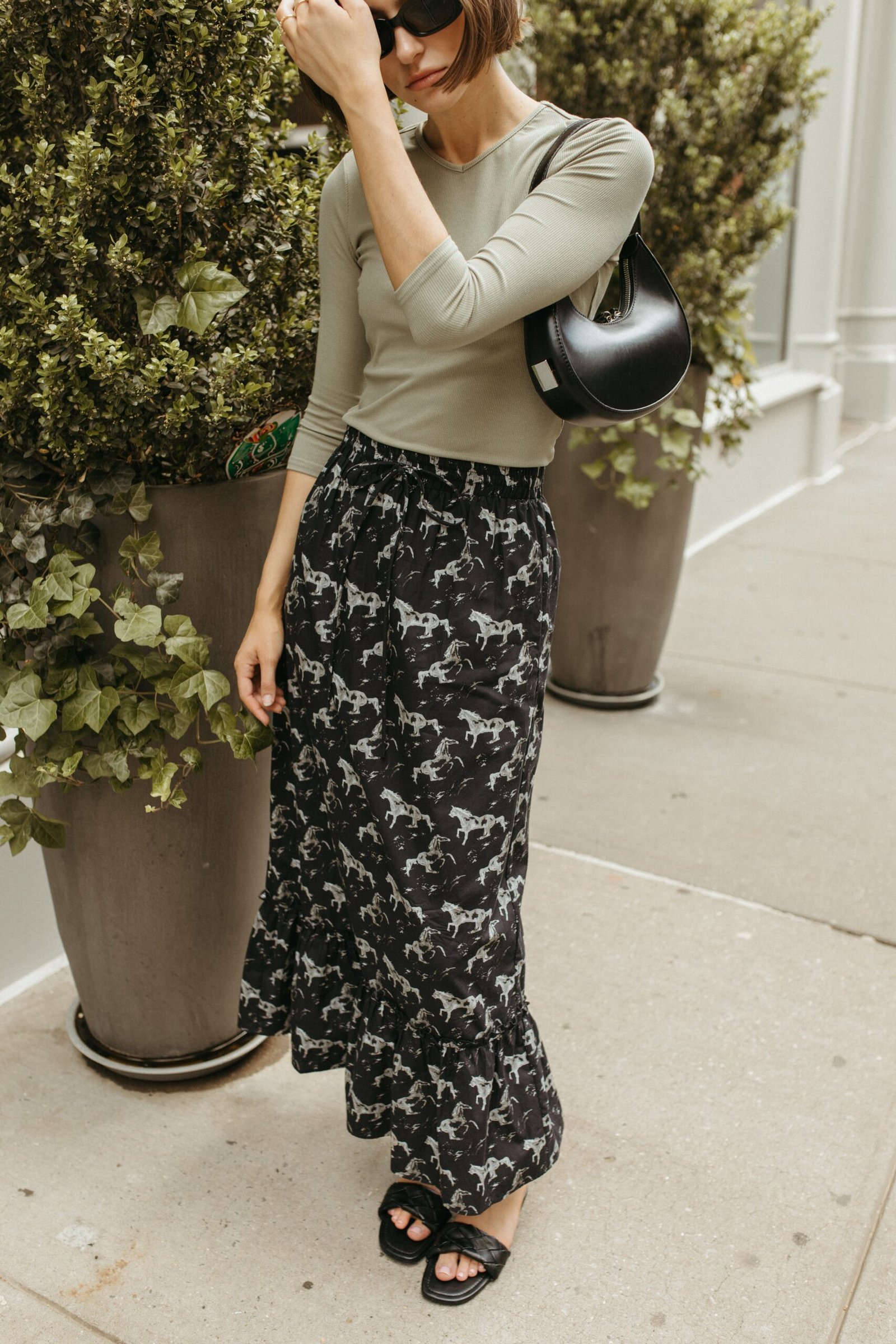 Get ready to gallop into style with our Black Horse Print Drawstring Skirt! Featuring a beautiful horse print for some playful coquette vibes. this maxi length skirt will add a touch of whimsy to any outfit.