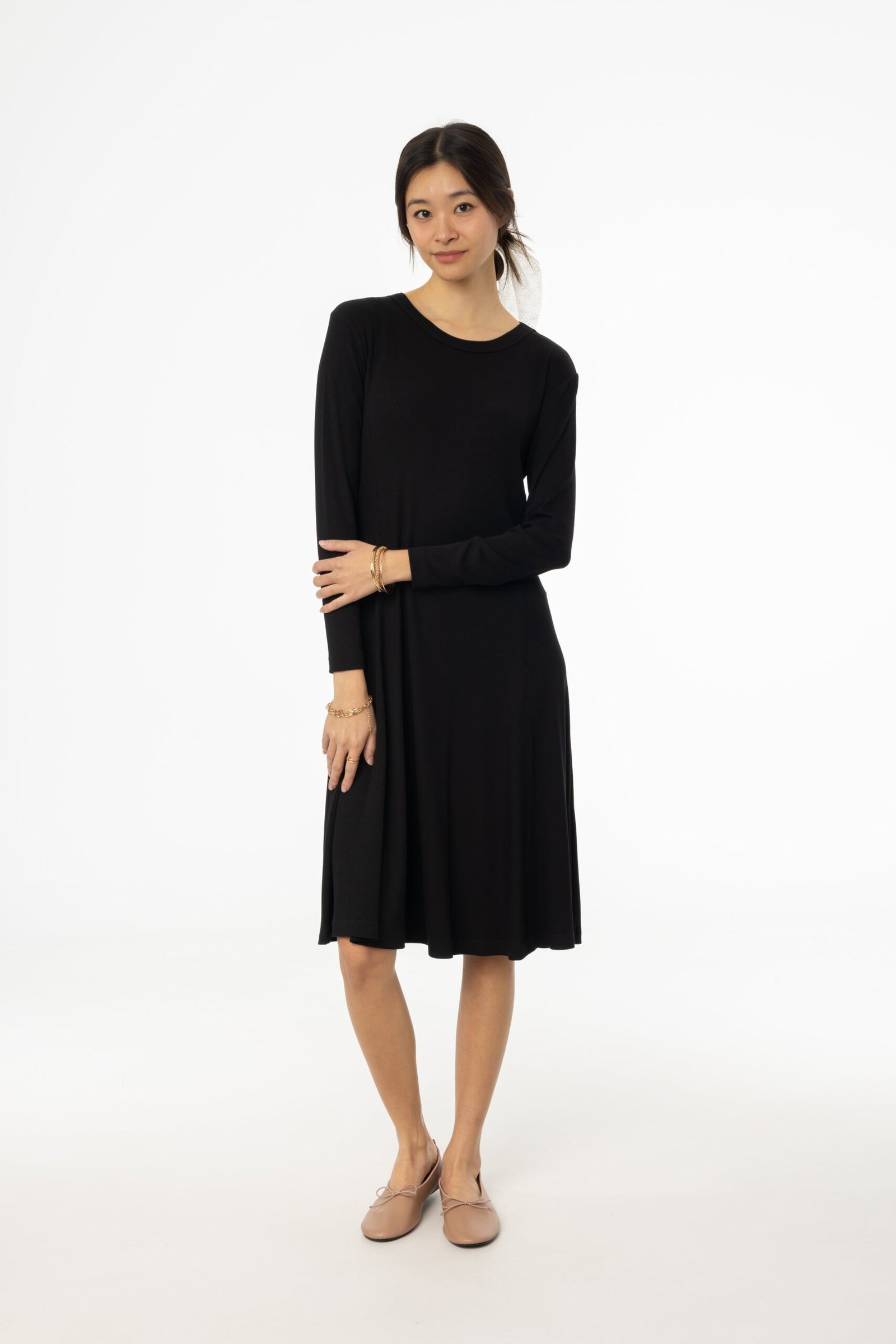 This isn’t just another black dress—it’s the one you’ll reach for. time and time again. The tailored stitching enhances the shape. while the flared cut keeps it light and flowy. Style it with statement earrings and a belt for a cinched-in effect. then add a Blue Denim Cropped Jacket when the evening cools down.